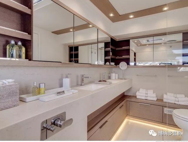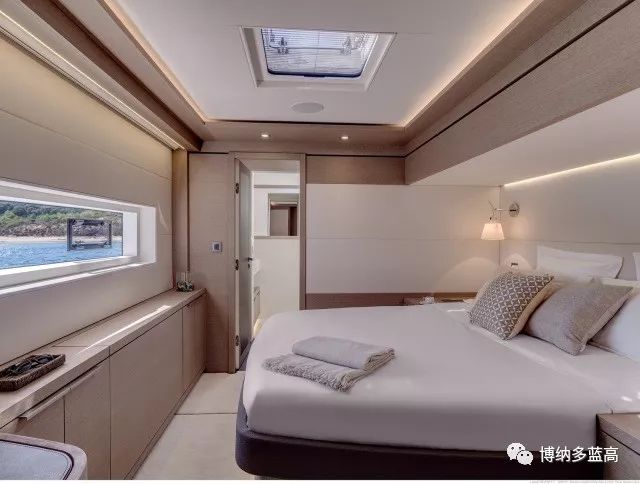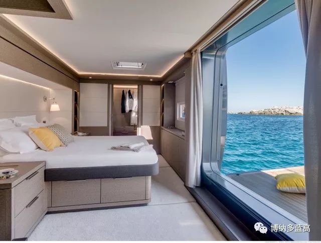 主人舱的空间达25平米,包括一张加大床、储物柜、书橱、书桌和沙发。除此之外,一个小型衣帽间和一个宽敞明亮的超大浴室给人一种家的归属感。