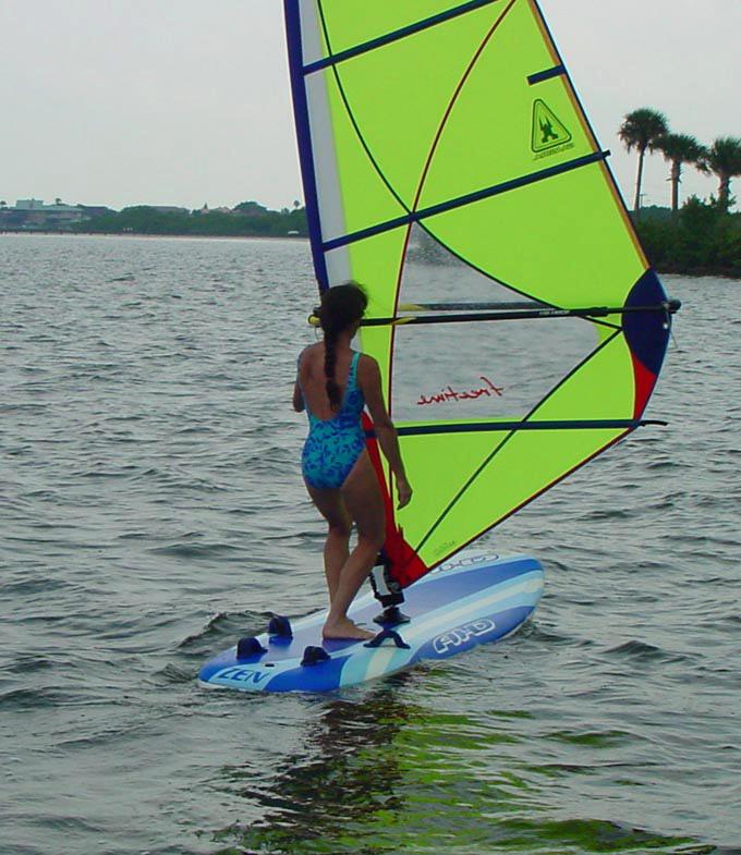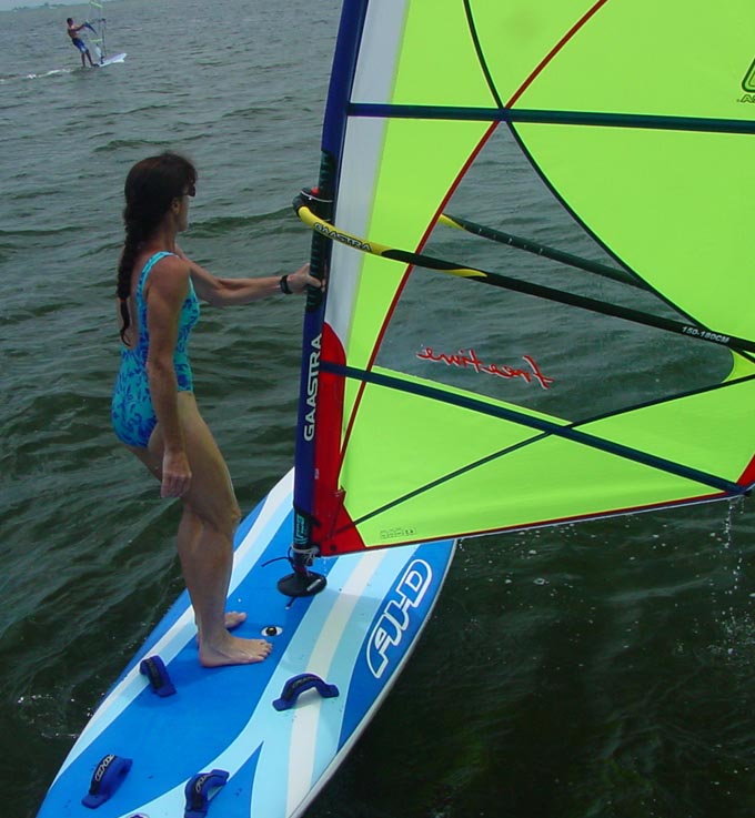 后脚(靠近板尾方向的脚)沿着板中间线向后退一步,紧接着前脚(靠近板头方向的脚)也往后退到桅杆后面并且让脚尖指向板头。同时把桅杆稍微拉直,与板体呈垂直角度。这时,帆随风而立,并不受风。