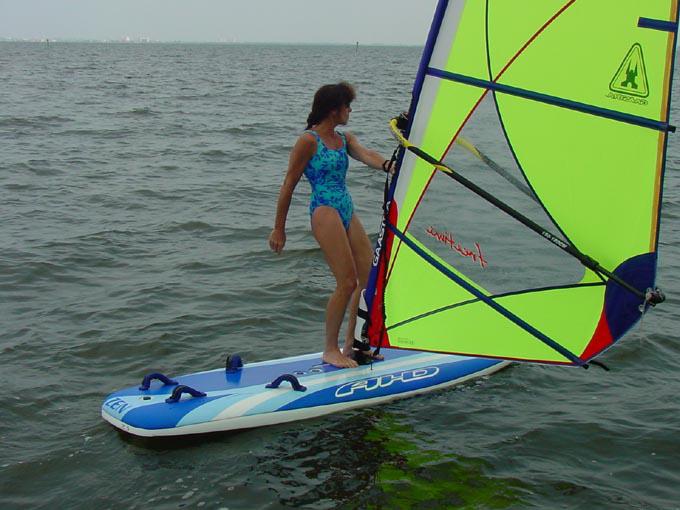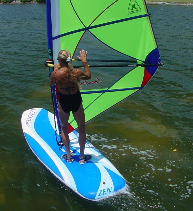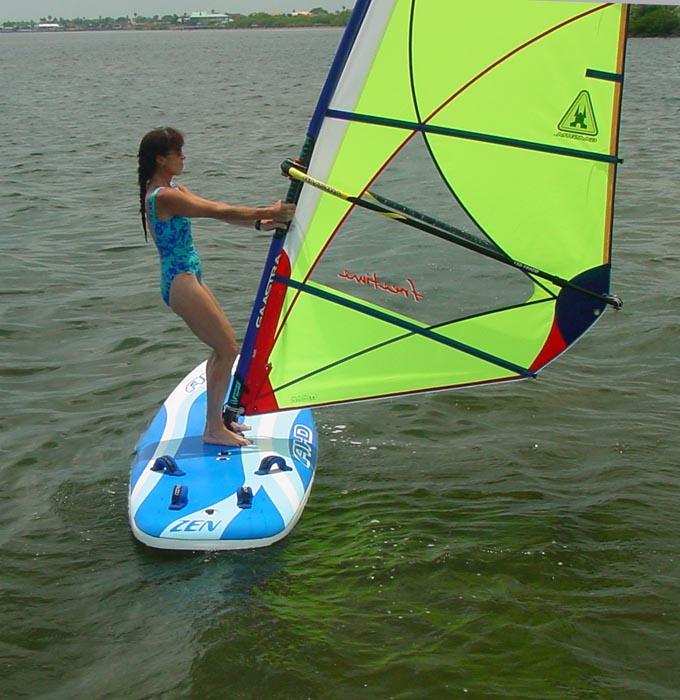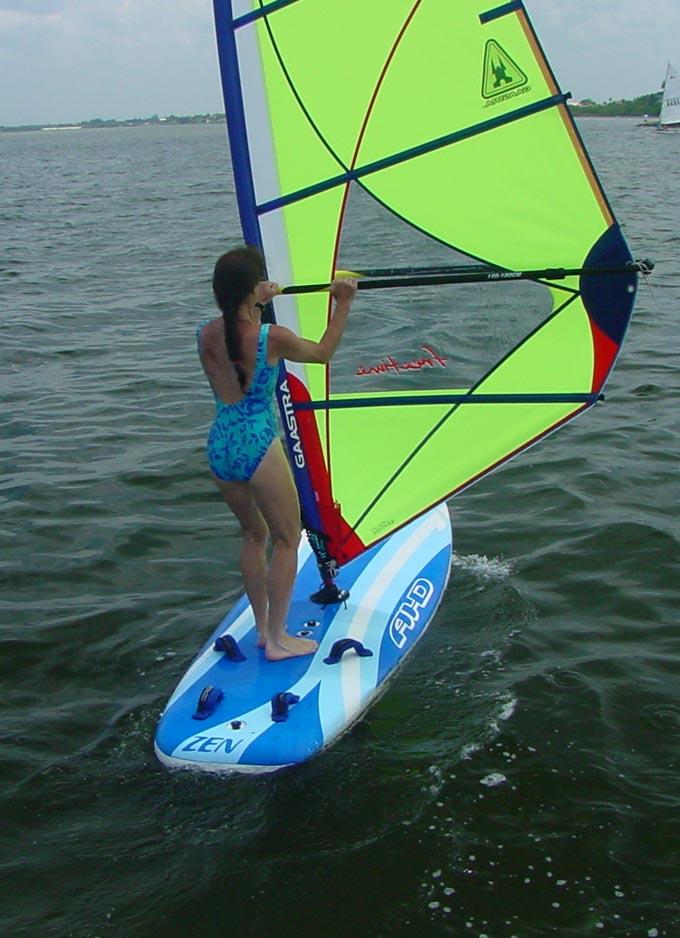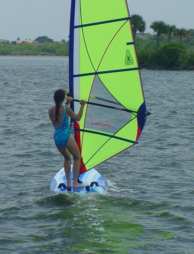 后手慢慢向身体内侧拉,把后帆角收紧,让帆受风,这时,你会发现帆板已经开始航行了。双臂尽量伸直、放松,用身体的重量去平衡帆以及风带给帆的压力。这是应让桅杆回到与板垂直的状态,避免不受控制的转向。