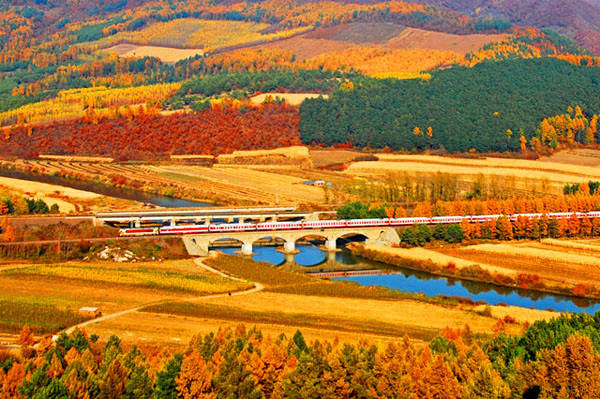 1.南北之旅:从最北到最南 ★列车:K1124 哈尔滨-海口 线路:哈尔滨-吉林-辽宁-河北-天津-山东-河南-安徽-湖北-江西-广东-海口 距离:4420公里 时间:64小时07分 价格:硬座462.5元/硬卧837.5元 铁路线如长龙般蜿蜒于林区间,感受东北独有的“铁道秋色”。 华东梯田美景,铁道沿线随处可见。