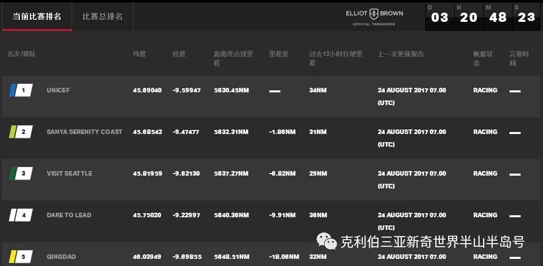 对于暂时处在第一位的联合国儿童基金会号,船长Bob Beggs相对谨慎,报告中说到:“在AIS(自动识别系统)上,我们持续收到了西雅图号、三亚新奇世界半山半岛号和勇往直前号位置临近的提醒,这一直让我们紧绷着一根弦儿,绝不能放松。”