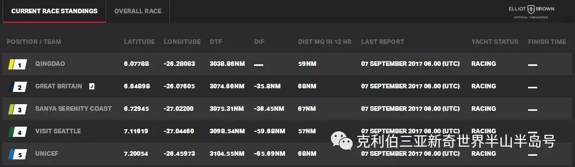处在第十二位的‘格瑞国际号’前几天临时转至波尔图对船长进行了转移救治,目前仍然是继续追赶着前方的大部队。临时船长Dan Smith报告说:“我们现在已经转向赤道无风带通道方向行驶了,我们目前的速度还不错。我知道前方的天气预告看上去很糟糕,但是还是禁不住希望今天的航行能比昨天要更好一些,这样我们就能够尽快的进入赤道无风带通道,开启机动力继续向南行驶,极可能多的把我们与前方赛队的差距缩小。”